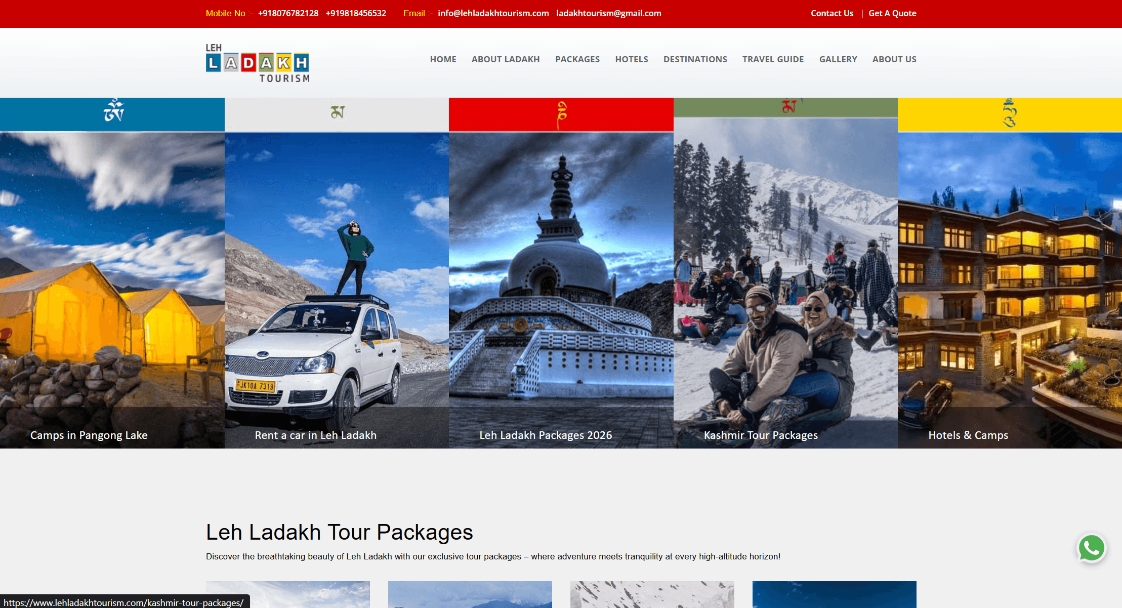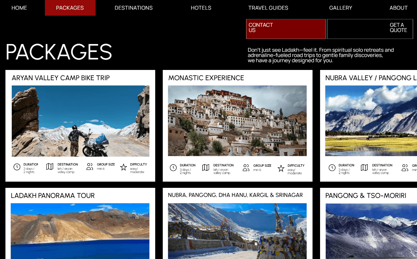 The site leaned on a red-and-white template aesthetic that, while functional, didn't carry a sense of place. Ladakh has an extraordinarily distinct character — high altitude, raw landscapes, deep cultural history. The visual design hadn't yet found a way to reflect that, which meant the site wasn't using one of its strongest assets: the destination itself.