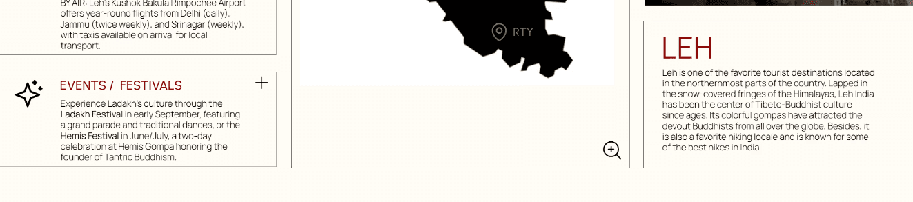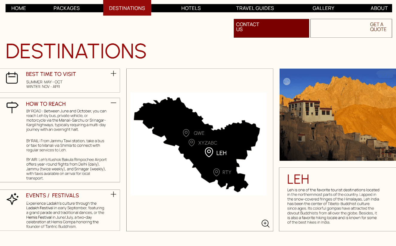 The redesign anchors the page around an interactive map of Ladakh, giving users a spatial sense of the region before they engage with any individual location. Practical travel information, including best time to visit, how to reach, and local events, was organised into an accordion panel on the left, keeping it accessible without crowding the layout. Selecting a location on the map reveals a large contextual image alongside an editorial description. The goal was for navigation to feel like genuine discovery.