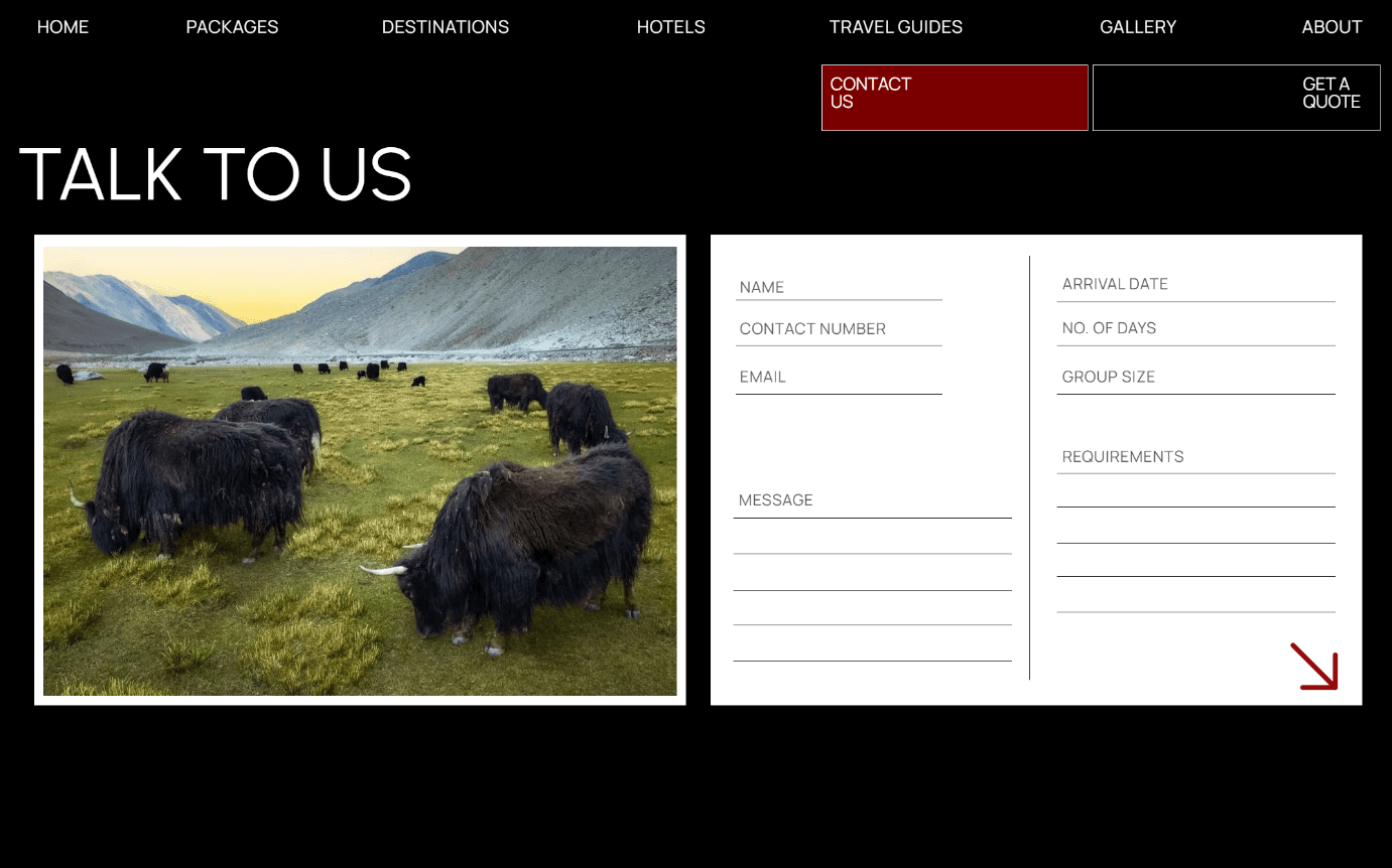 A large landscape image on the left gives the page warmth and context, making it feel like an invitation rather than a formality. The form itself was expanded to capture arrival date, number of days, group size, and specific requirements, turning the first point of contact into a lightweight trip-planning conversation. A directional arrow replaces a generic submit button, keeping the interaction minimal and on-brand.