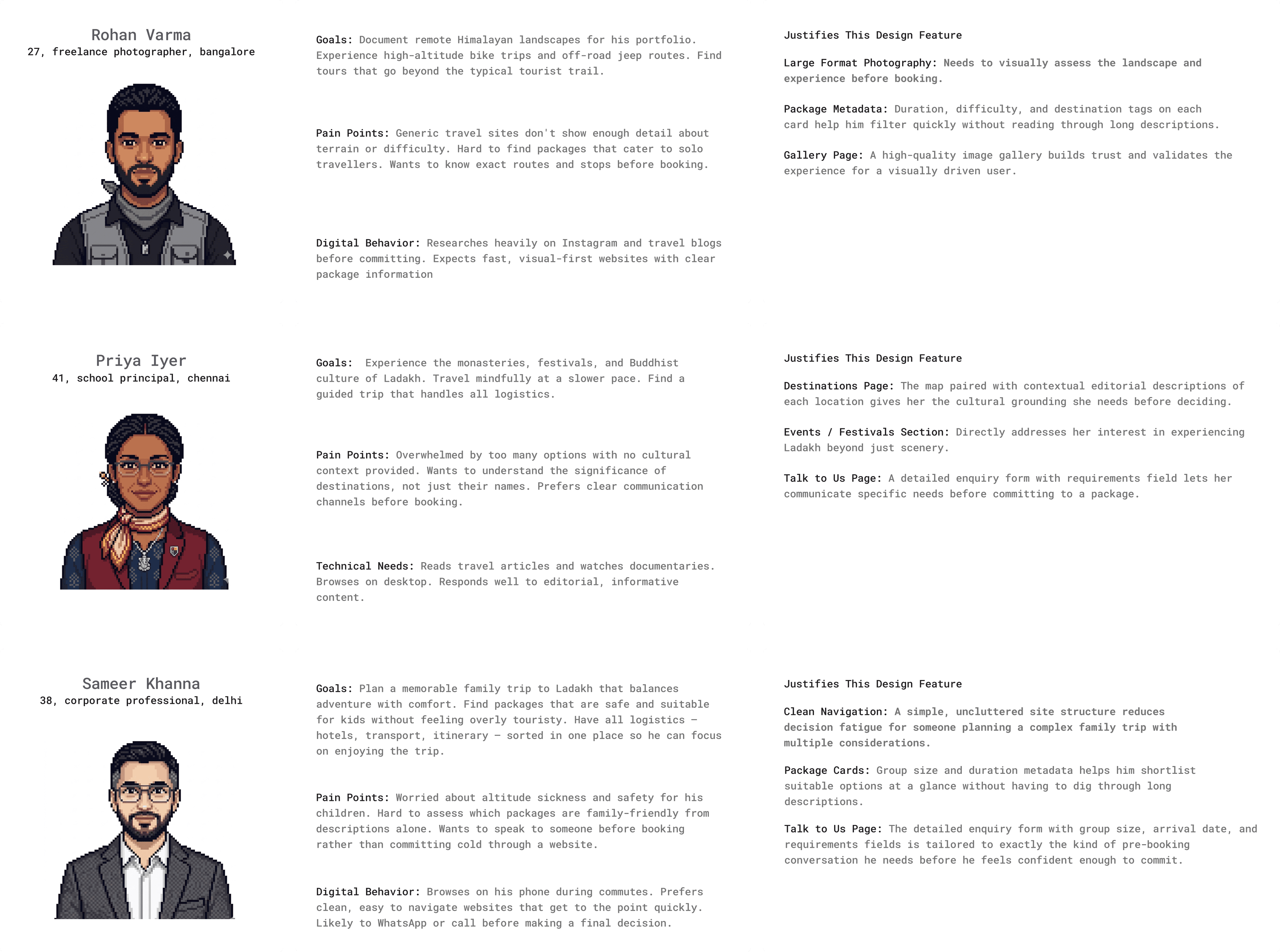 Three distinct traveller types emerged from that thinking. A solo photographer who researches heavily before committing. A culturally curious traveller who reads deeply and moves at her own pace. A family planner who needs logistics clarity and a human touchpoint before he books.